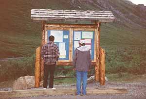 Bud and Ted looking over a bulletin board at Denali State Park. |